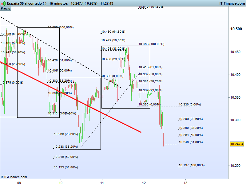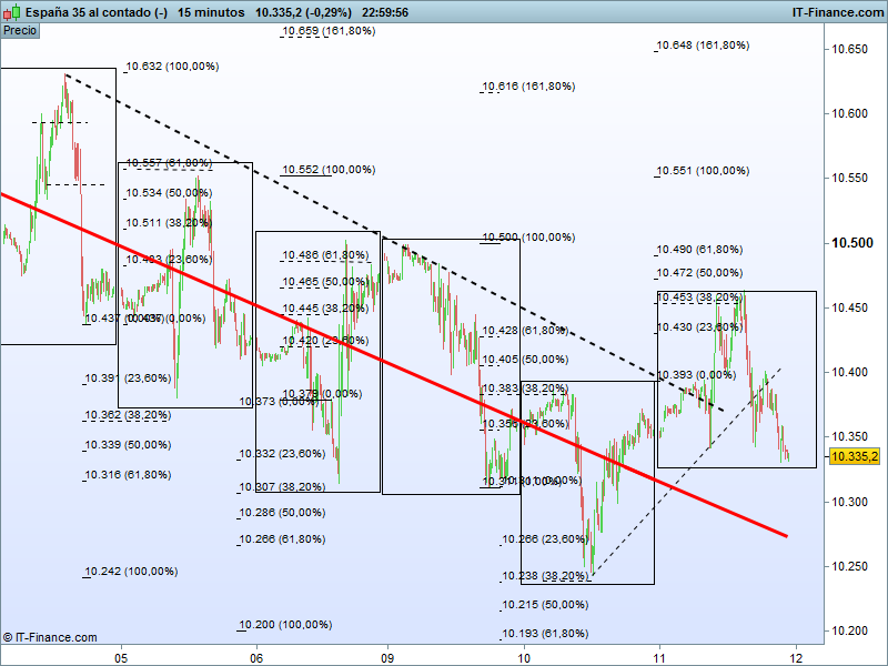 Si una sesión cerca de la apertura o al medio día rompe los máximos de la sesión anterior porque el día anterior cerro cerca de máximos, la probabilidad de que haga el rango diario a largos al 62% o el 100% es muy alta, si no pasa del 38 el rango lo hará a cortos ( salvo excepciones que haya penetrado antes al 62 del día anterior), sin datos estadísticos a ojo no se puede precisar más,( yo el Ibex hace años que no lo toco), al menos yo en las horas que mire esto por encontrarle como se mueve con los fibos y cierre-máximo-mínimo encuentras pautas, metiendo más tiempo en estudio se consigue mucha más información