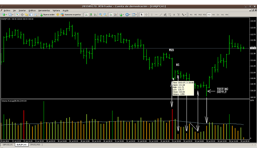 La siguiente (también sin marcar el nombre) es un No Supply, y esta vez si confirma, la siguiente barra aguanta el cierre que ha marcado el NS. Aquí se podría haber entrado. Pero claro, estos hijos de P... nunca tienen bastante, y preparan un Testing Supply , que para los minoristas, si tenemos el stop muy ajustado (porque nuestra cuenta no da para más) nos le hacen saltar, y más dinero para ellos. Con este movimiento borran cualquier atisbo se oferta del mercado.