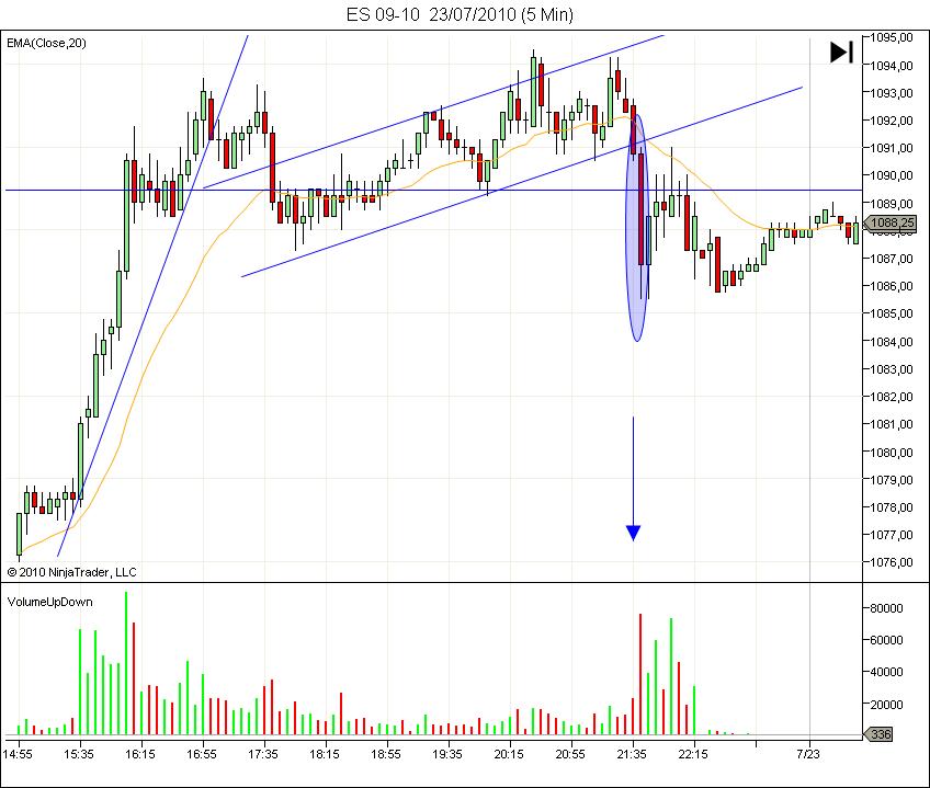 A ver si entre todos entendemos un poco lo que ocurrió ayer en el futuro del SP. Como podreis observar en el gráfico, a última hora se dió una barra de amplio rando bajista, con ultravolúmen. Ello me llomó MUCHISIMO la atención. Dicha cantidad de volúmen en 5 minutos tansolo puede ser absorvida por los grandes. Pero, entonces porque luego no continuó con la bajada? Que significa ese ultravolumen en barra de rango ancho super bajista cerrando casi en el extremo bajo???
