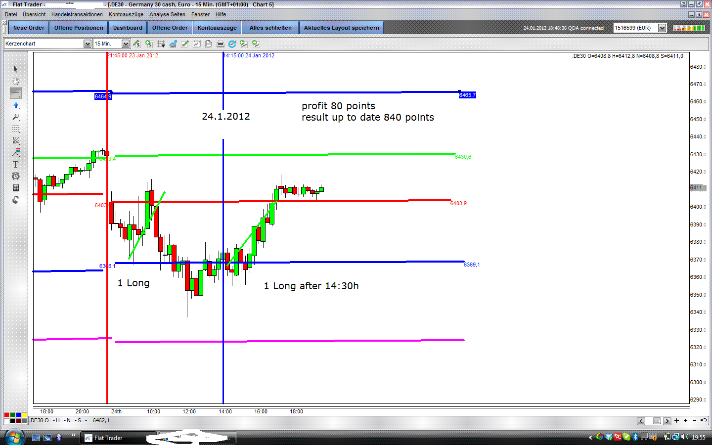 Hola George, en la segunda entrada en la primera zona, la MM20 se encuentra aproximadamente en la 1ªzona larga. Al basarse el sistema en la reversión a esta media, no hay mas riesgo de que no prospere? O la entrada es porque es después de las 14,30?GeorgM escribió:Control de fiabilidad de la FDAX-TRADING-STRATEGIE