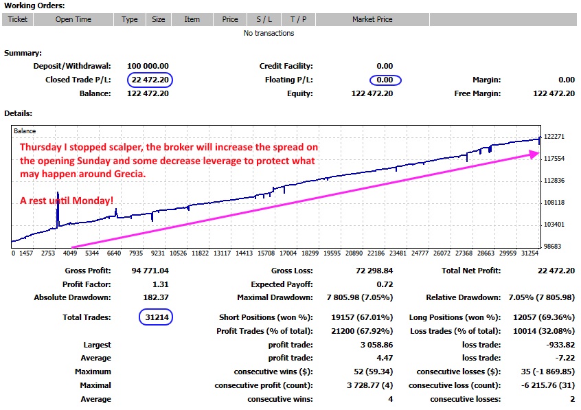Bueno, de momento estoy empezando con el sistema, y ya me he cargado la clave para todo este mes en la cuentra de scalping, por rebasar mi objetivo de beneficios diario, jejeje, pero la resulta es que este mes no cumpliré el objetivo de ganancias de la cuenta scalp (25%) así que ya no se ríe uno tanto. En la otra, por ahora va bien, aquí no hay objetivos de ganancias, ni perdidas mensuales, es una cuenta KamiKaze (con ciertos controles de mi ayudante), aunque calculo que debería rondar el 40-50% de beneficio/mes de media de aplicarse bien el sistema.