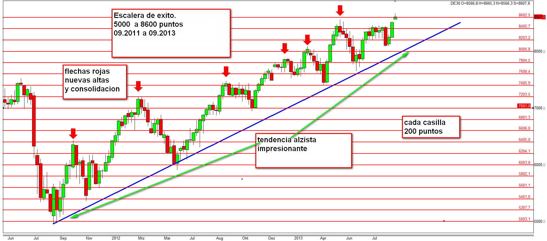 Adjunto grafico semanal del FDAX. Observamos desde 2 anos una tendencia alzista impresionante.