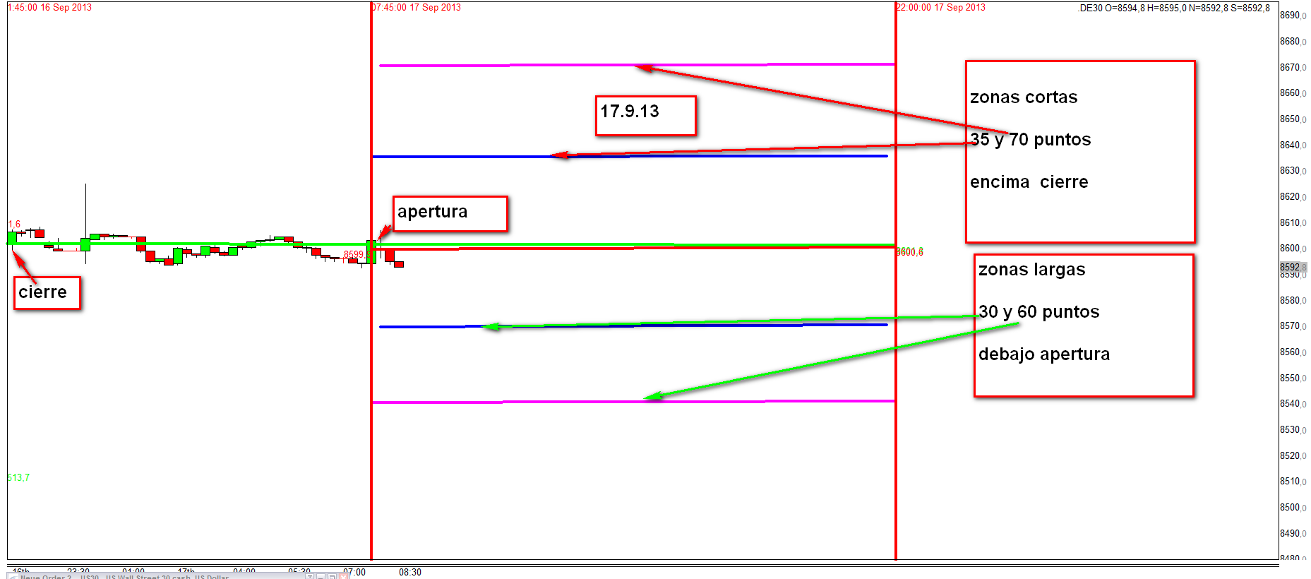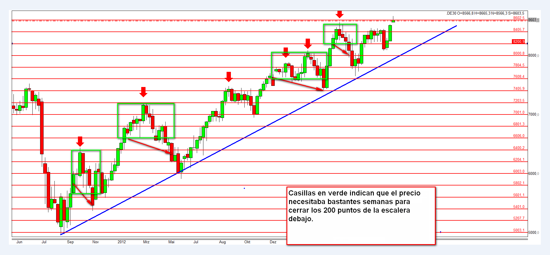 Mas impresionante aun es la probabilidad que una vez subido el precio la primera vez 200 puntos desde el ultimo pedano de la escalera este retrocedera a su tiempo por lo menos 200 puntos. Aprovechando intradia las zonas largas y cortas y al mismo tiempo manteniendo cortos futuros se obtiene un beneficio extraordinario.