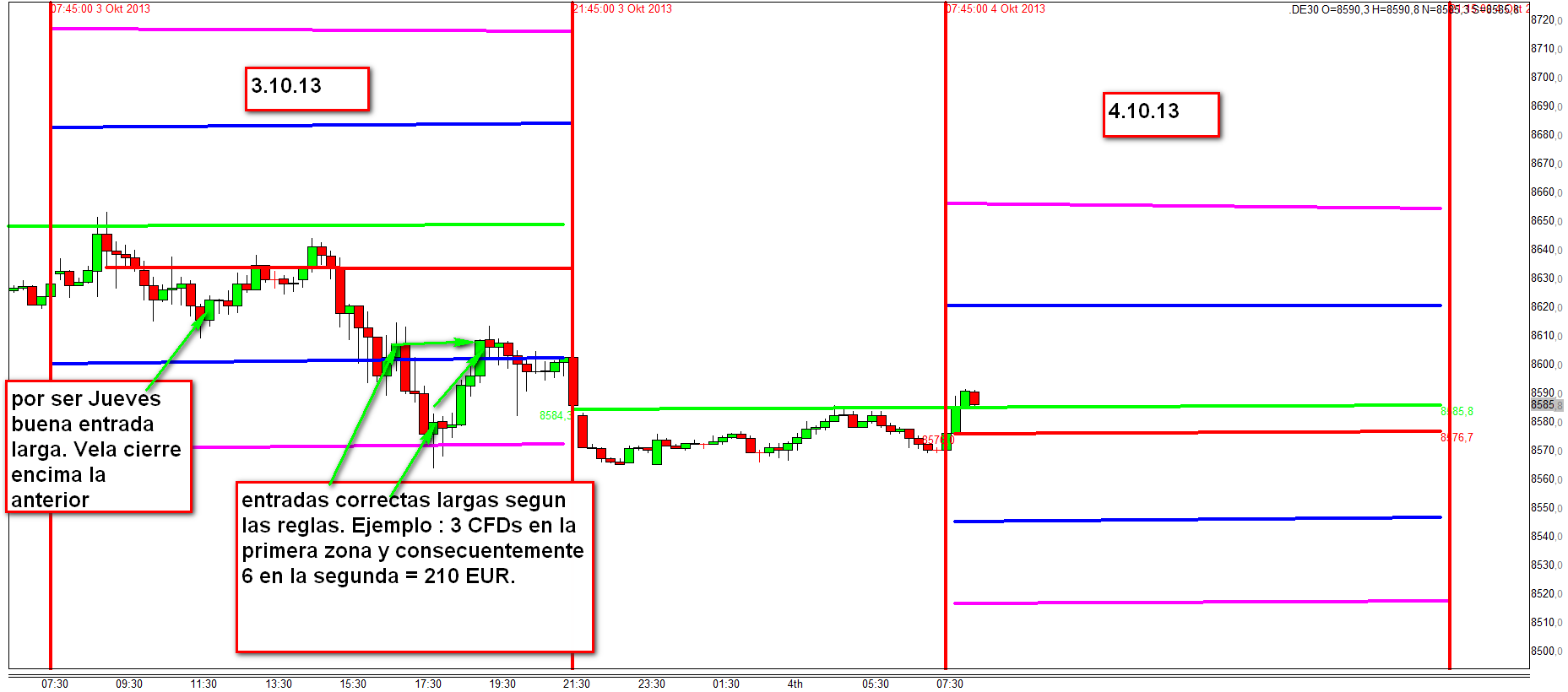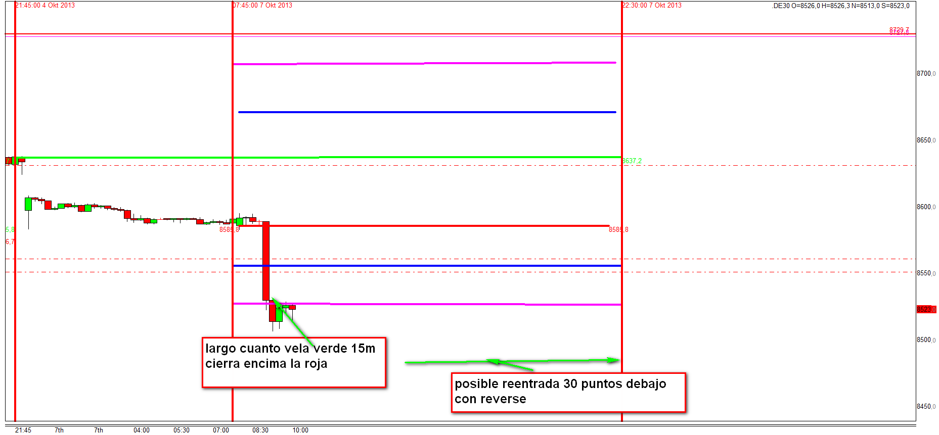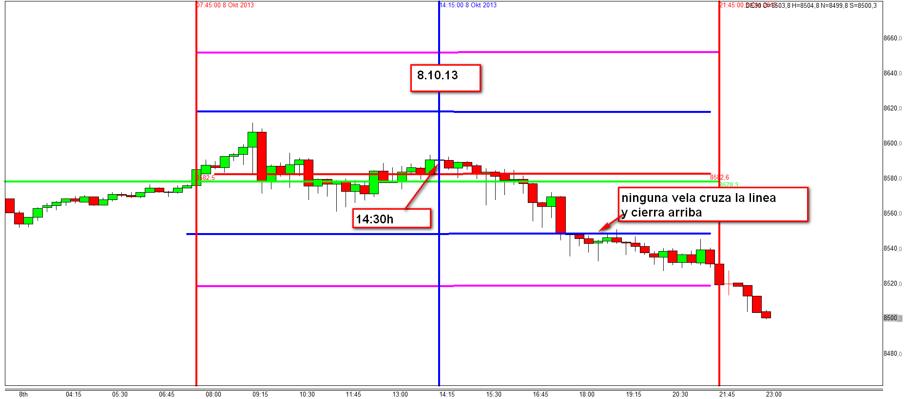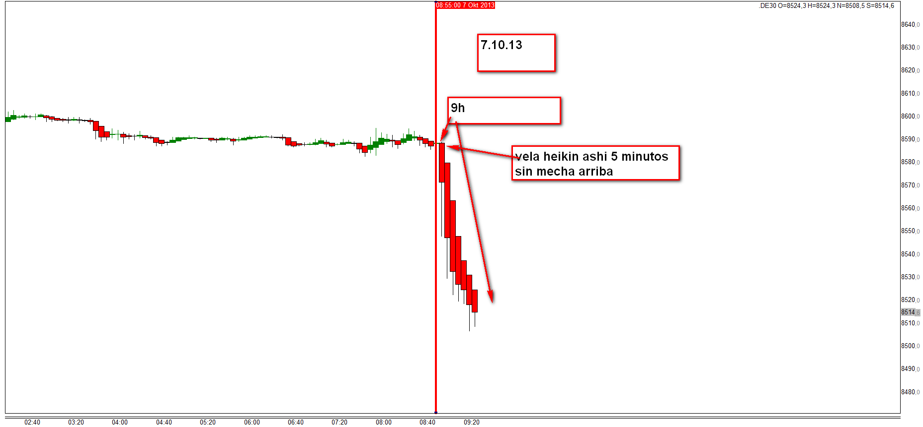 Entrada inmediata a las 8.00 h o 30 minutos después de la apertura si los precios de cierre de las velas anteriores no cotizan por debajo/encima del precio de apertura.