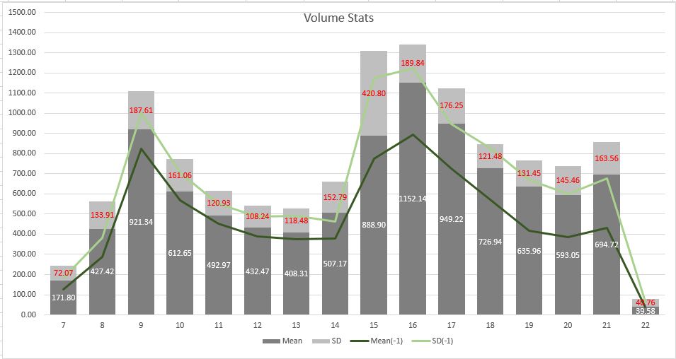 Como explicación a la gráfica, las barras representan el volumen esperado por minuto. Para hacerlo más preciso, lo he dividido por horas de negociación y las líneas representan dicho niveles de la semana previa siempre por minuto. Cada barra, así como las línea, se compone de dos partes, la media y su desviación típica (que mide las desviaciones con respecto a la media) por tanto la suma de ambas (media más desviación típica) nos ofrece el valor esperado.