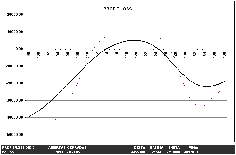 estoy echando números y el conjuto de mi posición es algo así como un Iron Condor tremendamente tocado de delta negativa. Si el mercado tira para arriba, en términos de delta, lo que haría sería comprar calls y vender puts para compensarlo.