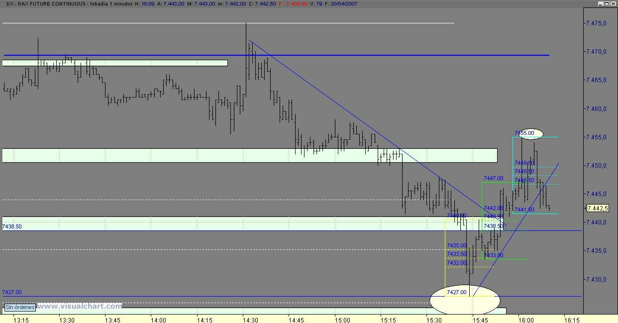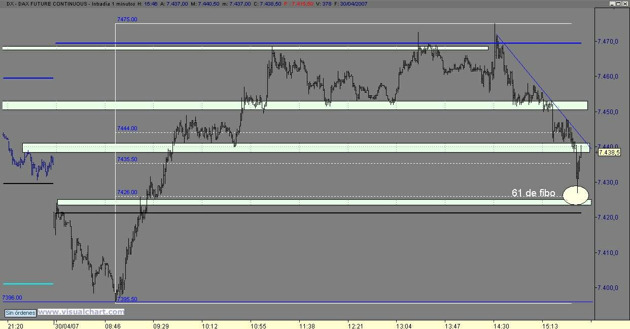 Me parecen cojonudas las explicaciones de Bimojim pero poco prácticas. Me explico: es muy fácil pintar retrocesos y proyectar objetivos con un mínimo de conocimiento sobre análisis técnico, pero ya no lo es tanto cuando esas decisiones hay que tomarlas en tiempo real. Cuando llegue ese momento se desvanecerá el castillo de naipes. No pongo en duda que él pueda poner en práctica esa operativa jugando con Stops de 1 a 4 puntos, lo que permite aspirar a ratios envidiables en cualquier estrategia, ya sea automática o manual, pero no nos engañemos, si ya resulta difícil operar con el DAX con stops más amplios, imaginaros el nudo en el estómago cada vez que toca abrir posición. Suaviza algo la tensión el hecho de que nos jugamos unos ridículos 4 puntos, pero 4 puntos ahora, 4 más tarde y los 20, 30 ó 50 que dejaremos de ganar las veces que nos quedemos bloqueados y no abramos posición, minarán la moral al más crédulo.