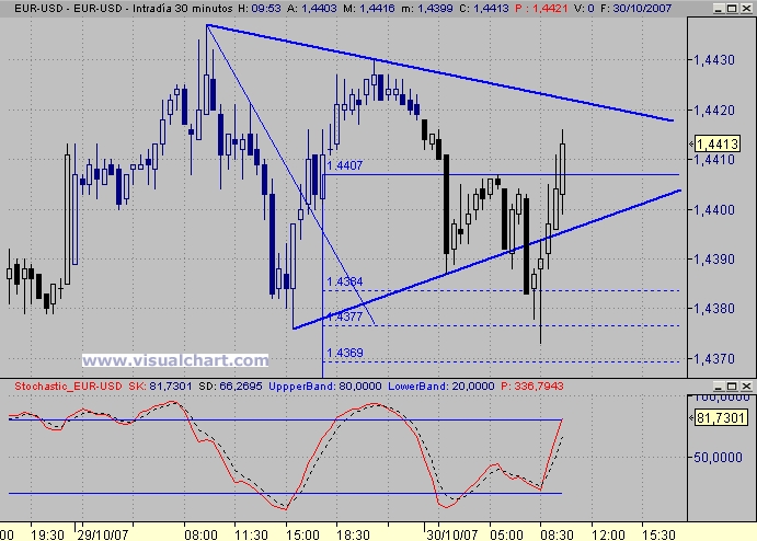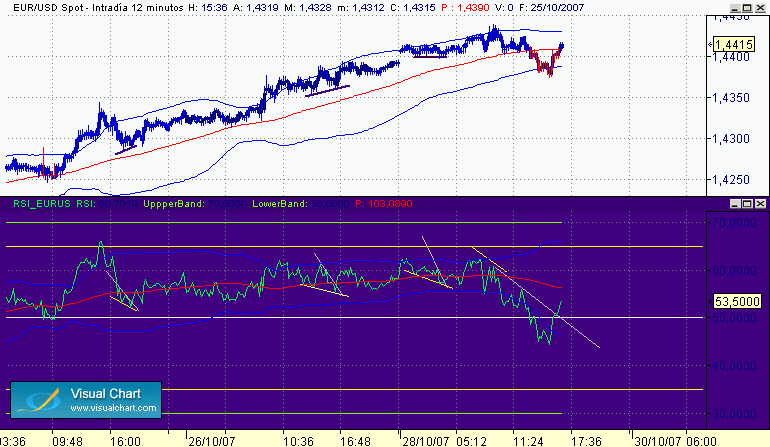 Hay alguna posibilidad de que vuelva al 1,4280, pero esta dificil. Rechaza hasta volver al techo roto en 1,4350, de continuo estropea las figuras bajistas abortándolas en el pullback. El recorte que debió hacer desde el 1,4430 apenas ha tenido recorrido, además de hacerlo despacio y lavando sin parar y no ha sido capaz ni de llegar todavía a testear soportes importantes. Con ello te digo lo que me dijeron a mi en mis comienzos: " más vale perder que perder más" si no baja pronto y hace un suelo por aquí hay que empezar a pensar en el 1,4530-40 de Dkvas. A mi modo de ver, lo que hizo ayer no es un doble techo, es un triángulo de continuacion de tendencia, al ser un triángulo regular puede romper tanto arriba como abajo, pero después de romper abajo no ha confirmado dirección y de momento ha rechazado el corto. Cuando una figura es saboteada en al dirección de la rotura y no confirma , indica que la fuerza contraria es muy grande. Debe volver a perder el 1,4396 y no recuperarlo para que baje al menos hasta el antiguo máximo. De cualquier modo te deseo suerte.