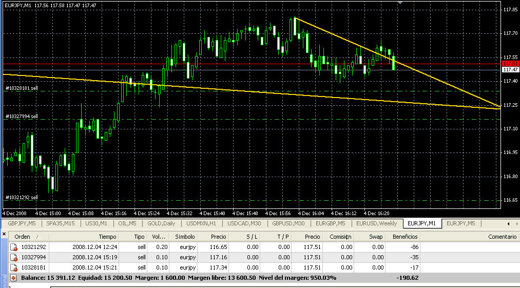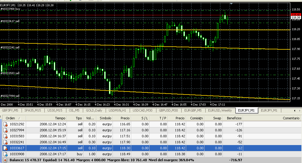 He hecho lo contrario y encima en horario de volatilidad. En el gráfico y posiciones veréis lo que ocurre. Ahora estamos perdiendo, pérdidas asumibles, pero perdiendo y lo que es peor, con mucho riesgo asumido y con el margen dispuesto bastante alto: 4.000 euros frente a 10.800 disponibles. Y sólo hemos sacado al movimiento 64 euros más que los que teníamos antes frente a unas pérdidas pendientes de más de 400 euros más que los que se tenían en ese momento.
