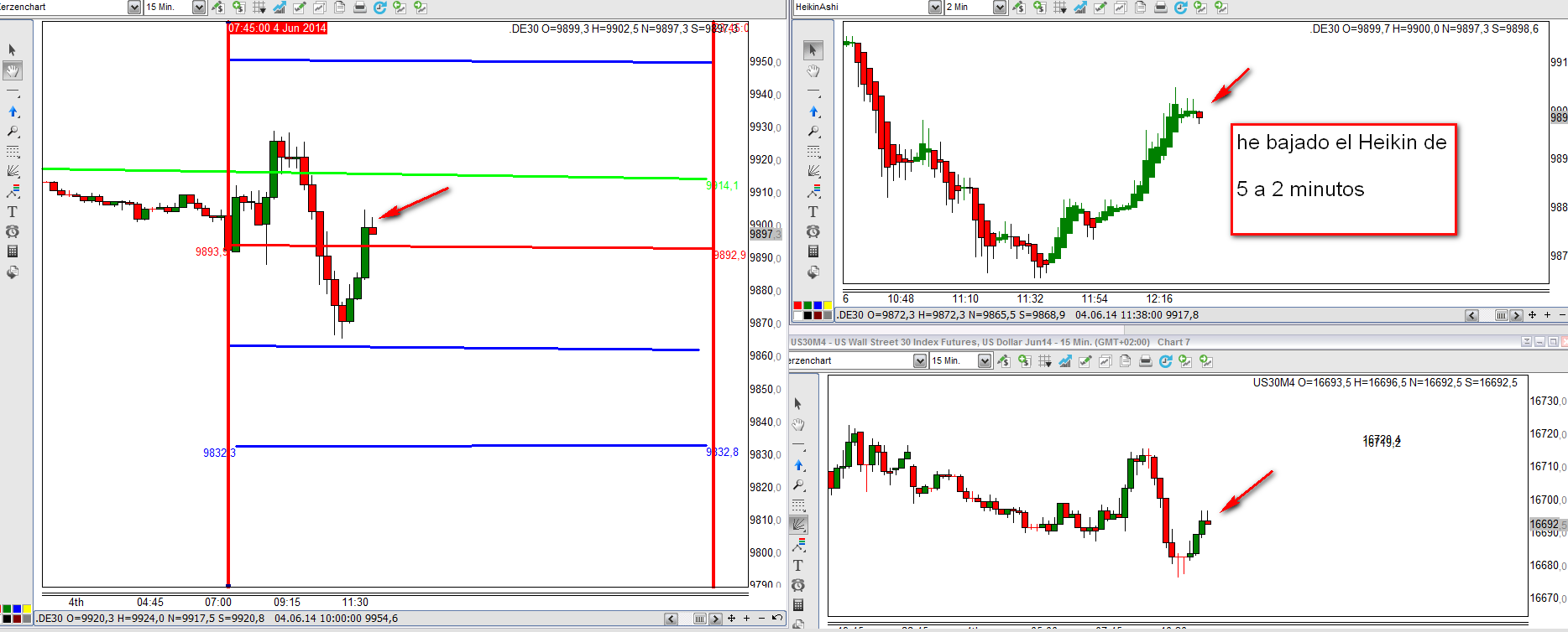 Salido con un buen trade. Observad que para salir he bajado el Heikin Ashi de 5 a 2 minutos.