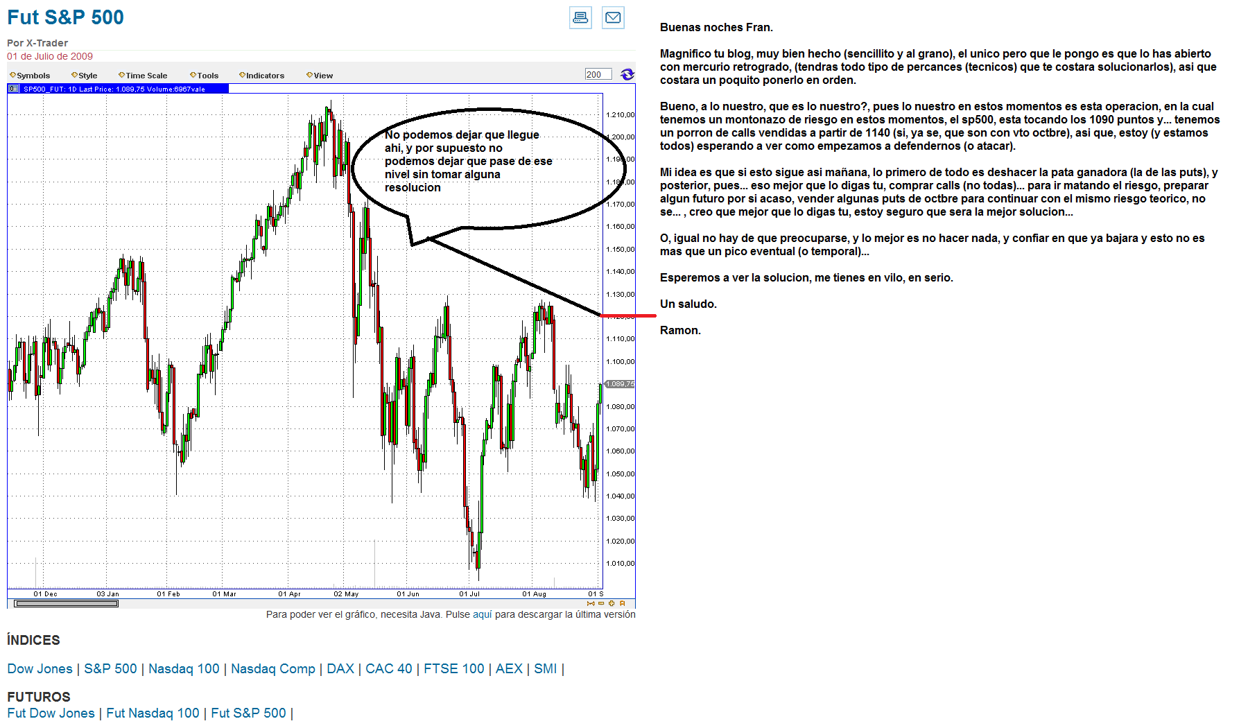 Tal como venía el asunto tenía marcado el 1.100, pero no esperaba que lo alcanzara en un hueco de apertura de diez puntos. En estos casos las probabilidades de giro son importantes pero hay que tomar decisiones y así lo he hecho: ante la duda sigues con lo planeado y a otra cosa. Es como tu recompra de calls: una buena decisión si es lo que tenías planeado independientemente de lo que el mercado acabe haciendo. Permíteme ¿Cual es tu criterio para la elección de coberturas o cierre de posiciones? (si prefieres me puedes contestar en privado)