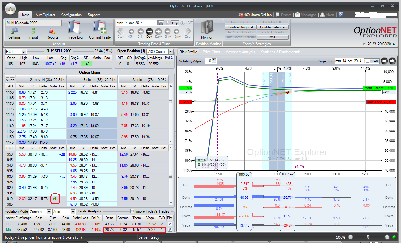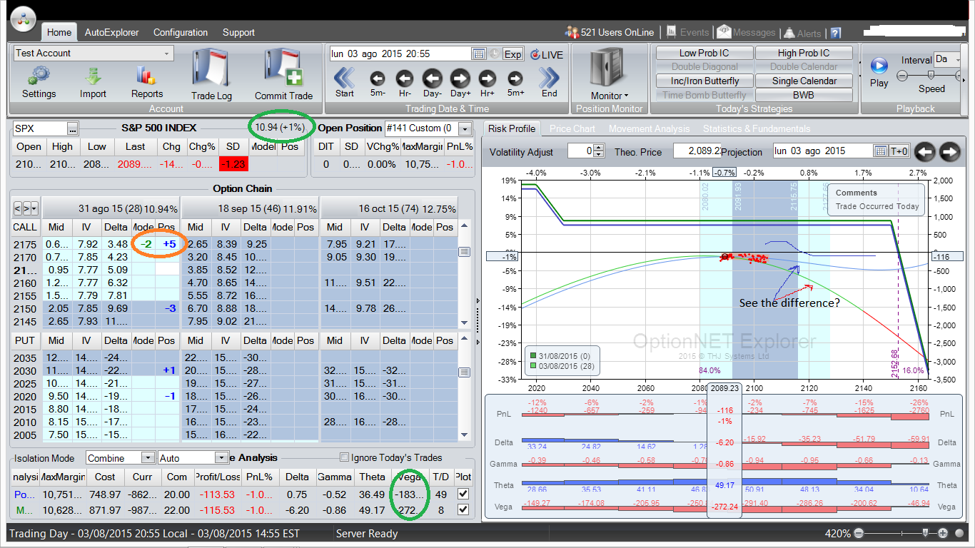 No es más que un pequeño ejemplo del impacto de los cambios de volatilidad implícita sobre el perfil de beneficio ó pérdida de este tipo de combinaciones, y como muestra de que es un factor más a considerar en el set up de las mismas. No es que sea el más importante (lo es la delta, con diferencia), ni que este tipo de estructuras no acabe en beneficio, muchas veces, pese a estar en pérdidas iniciales en ocasiones debido a estos cambios de volatilidad, pero siempre viene bien el saber cuál es la razón de que podamos estar en pérdidas si hacemos delta neutral con income trading y el subyacente no se ha movido mucho. A menudo es por el cambio en la volatilidad.