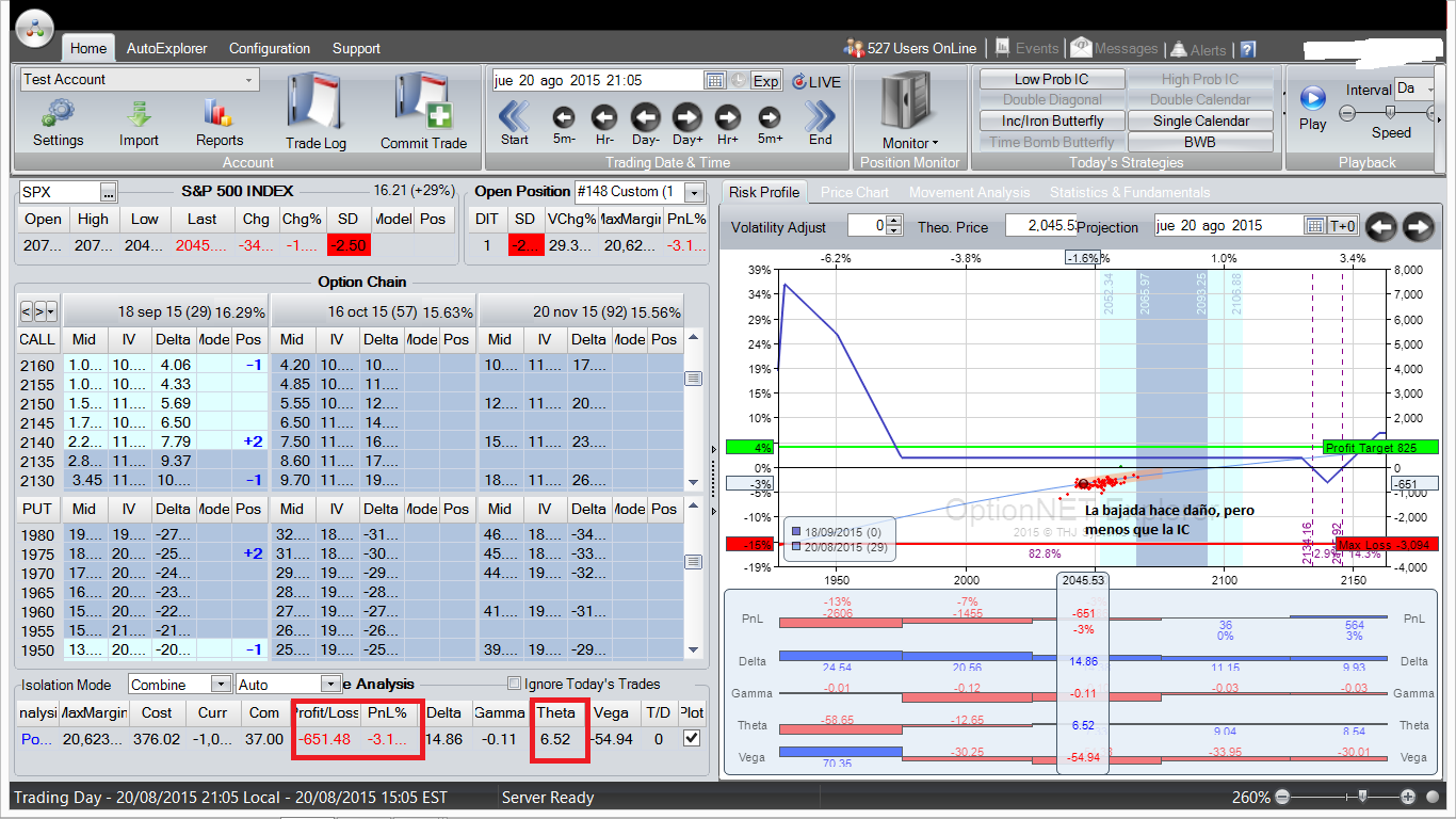 La posición se complementa con 5 credit spreads en el lado put (que no se ven aquí) y un debit spread en el lado put, que le da a la posición su "campana) y actúa también como cobertura de volatilidad.