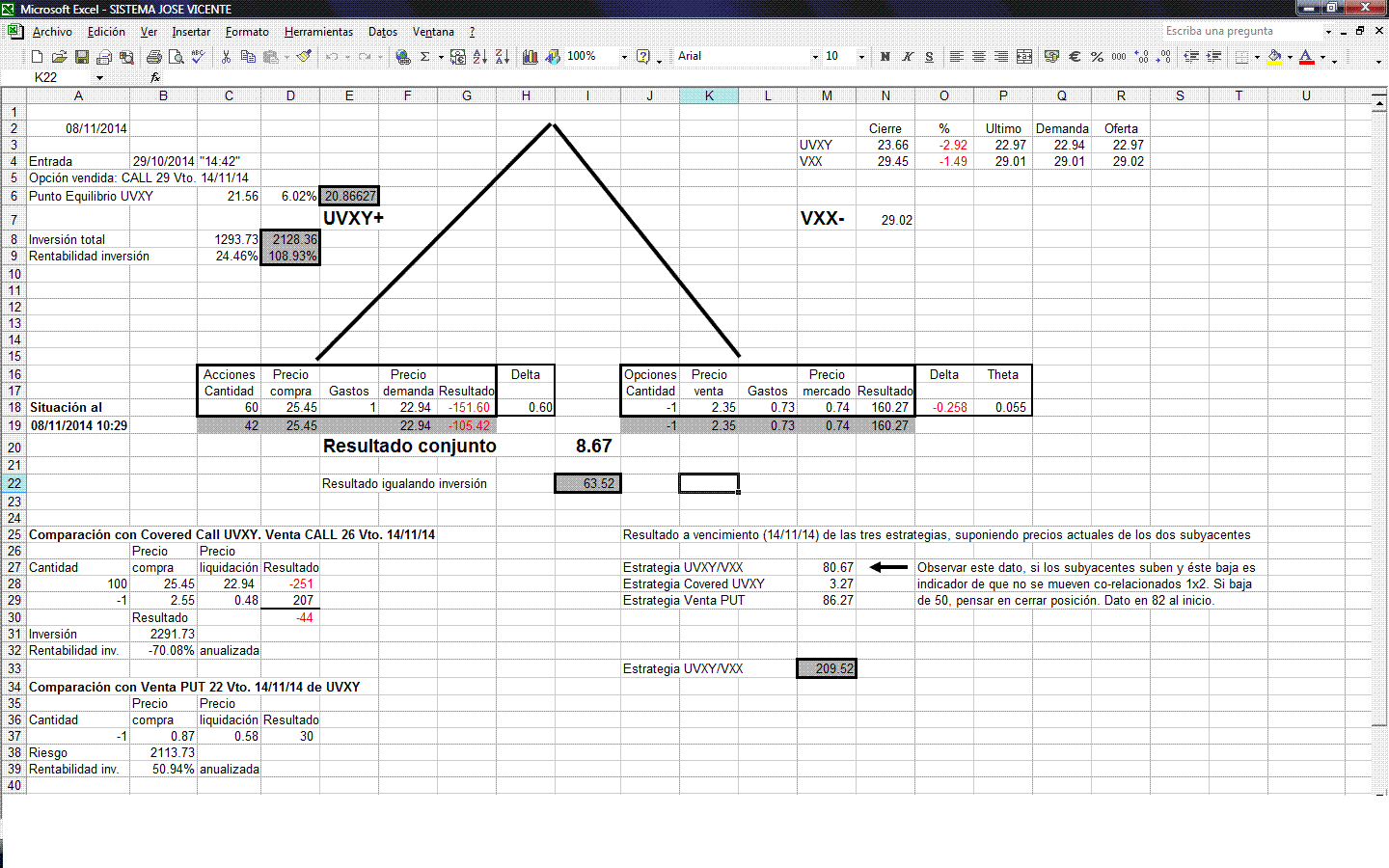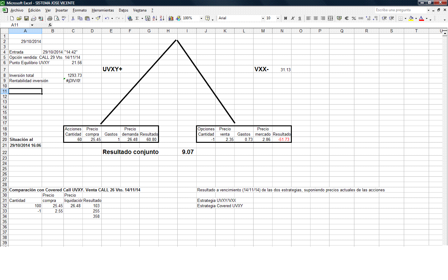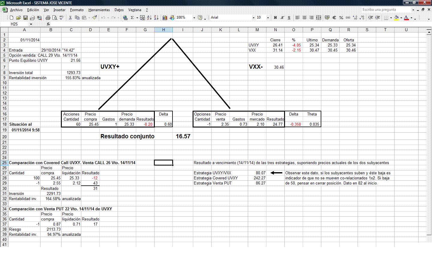 Mi criterio de que en caso de subidas, UVXY se revalorizará más que VXX se basa en la simple aplicación del interés compuesto, si evolucionan subiendo UVXY el doble que VXX, tendría que funcionar, de todas formas, he colocado un indicador en el excel que me va a ir señalando si esto se esta cumpliendo.