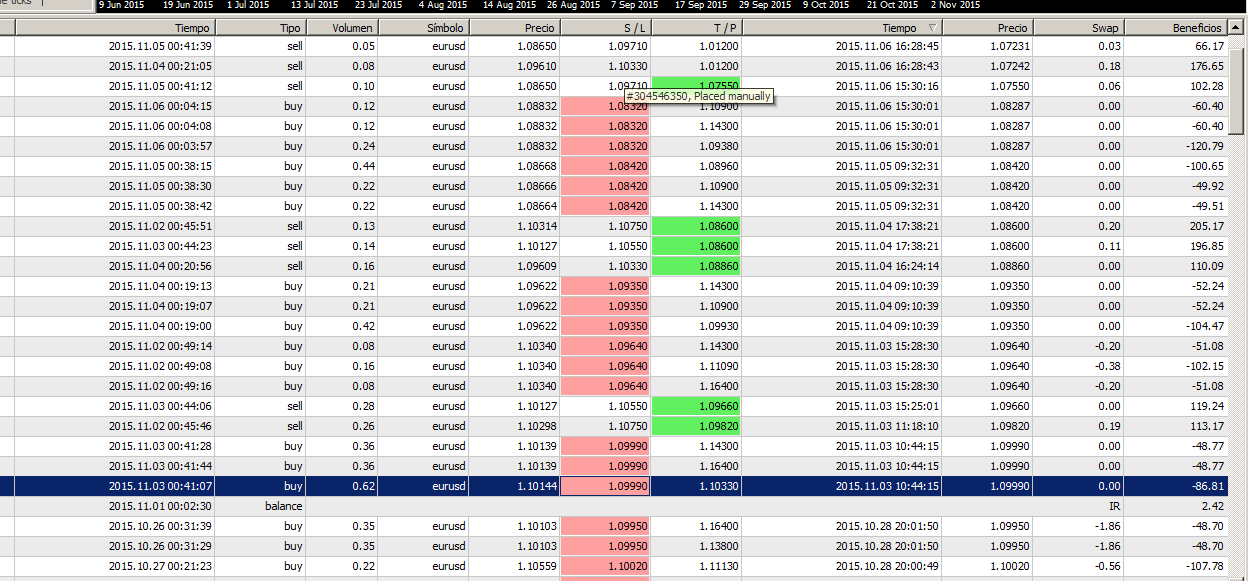 Habréis observado que las dos últmas órdenes del día 3 de Noviembre están sin numerar y van marcadas con dos asteriscos (**). La razón es que al parecer olvidé documentarlas aquí en el hilo, ya que estuve dos o tres días sin entrar a actualizarlo. Me he dado cuenta justamente mientras hacía los cálculos para escribir este post, no me cuadraban los números y he tenido que buscar a ver qué pasaba. Para no despertar suspicacias, os añado la captura de pantalla del "Historial de Cuentas" del MetaPajas. Que nadie crea cosas raras, de todas formas cualquiera que haya seguido el hilo se extrañaría de que no hubiera puesto ninguna orden ese día con ese gráfico...