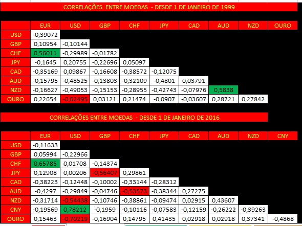 Quanto a forex no hay un par que yo considere que es el benchmark pero historicamente tenemos la seguinte tabla de correlaciones (estas correlaciones fueron calculadas com mis formulas, no es un calculo linear):