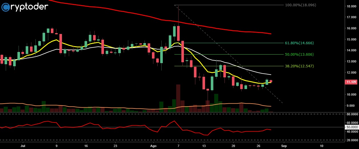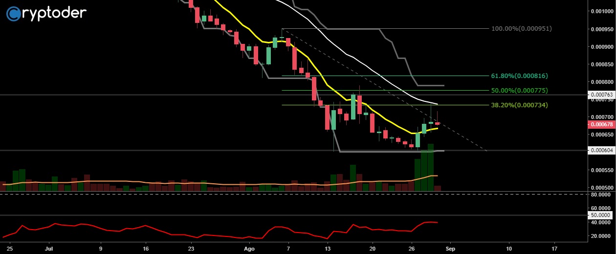 El precio logró romper el canal bajista en el que se había estancado por semanas, ahora lo más importante es que el precio logre romper la resistencia en los 0.000764 BTC (‎€4,56) para ver una recuperación real.