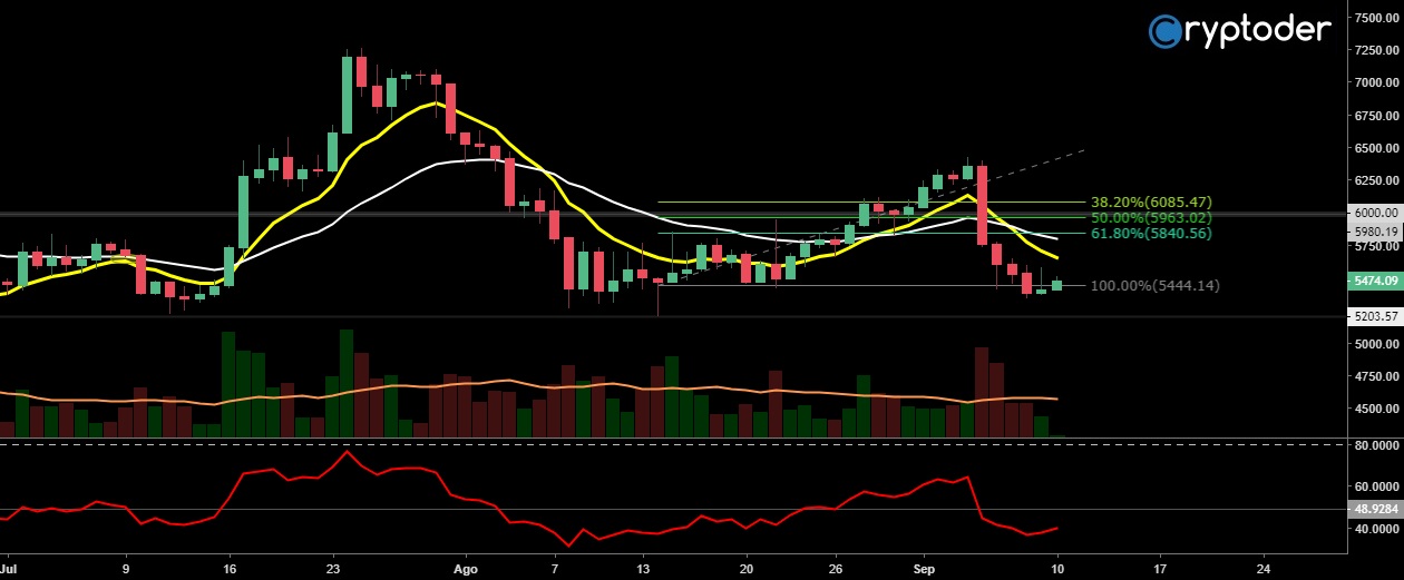 Inicia la jornada mientras el precio de Bitcoin se negocia por debajo de los €5500 el precio está respetando el soporte marcado en los €5200 lo cual permite que el precio de Bitcoin experimente una leve recuperación la cual inició durante la jornada del domingo.