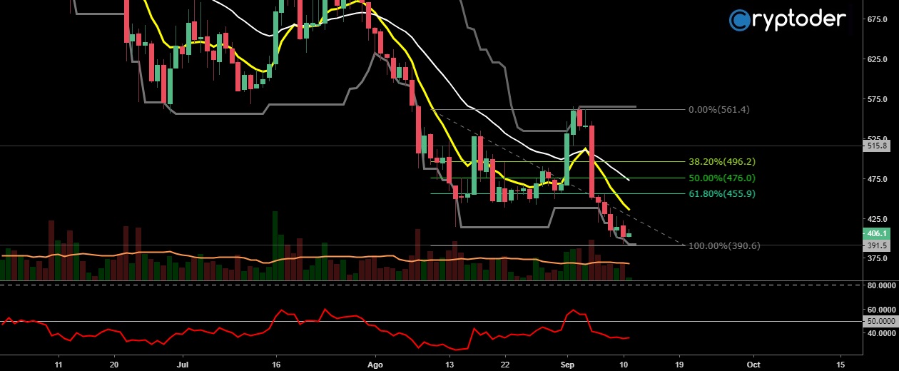 Desde un punto de vista técnico, Bitcoin Cash se encuentra en un área dominada por bajistas, el intento de recuperación del precio acabó en un cruce de medias moviles EMA 9/26 a la baja, rompiendo el soporte trazado en los €453 provocando que el precio se desplomase hasta los €391.