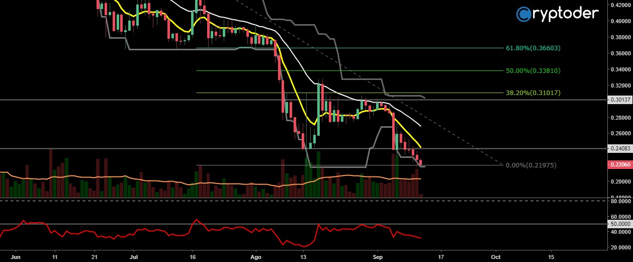 Podemos observar como el precio toca la parte inferior del Canal Donchian el cual actúa como soporte principal en los €0.22. Por otra parte Ripple Labs ha tenido al menos 3 denuncias ante la corte en diferente estado de USA creando desconfianza, por lo que muchos inversores prefieren resguardar sus ganancias en criptomonedas como Bitcoin.
