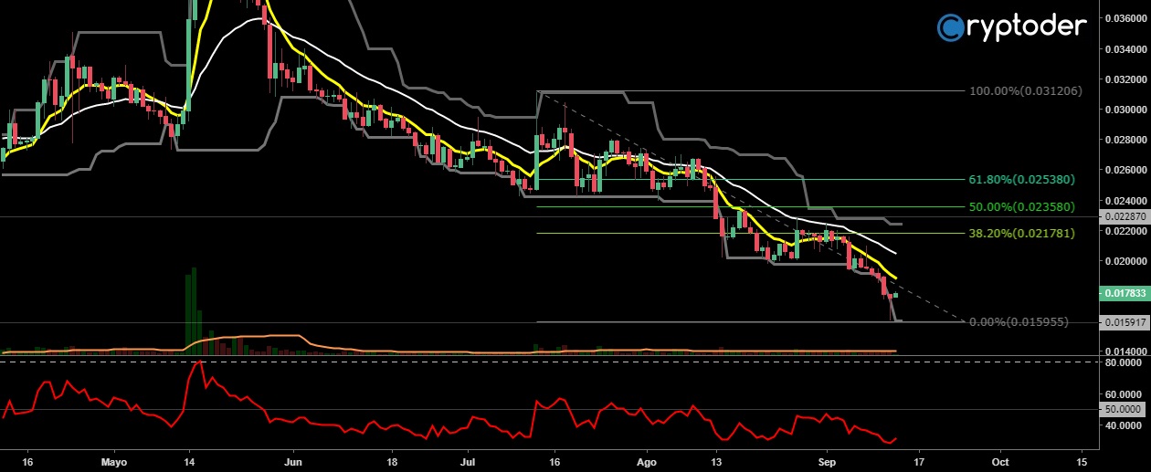 Analizando el gráfico de 1 día ZEC/BTC podemos apreciar el canal bajista al cual Zcash ha estado sometido, el precio rompe el canal Donchian en su parte inferior de los 0.017073 BTC (€93,63) antes de experimentar una leve recuperación.