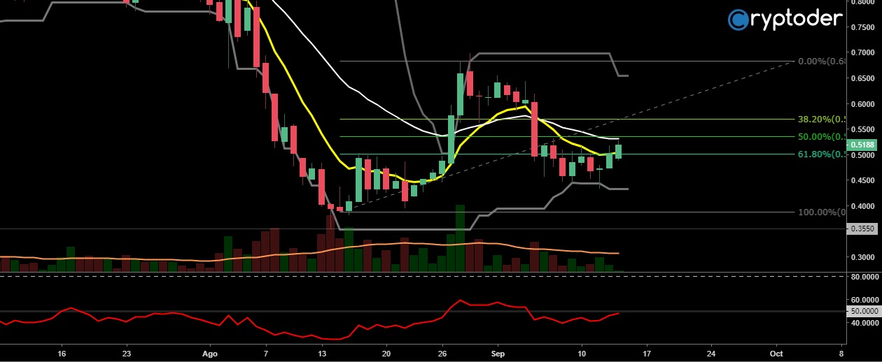 Dibujando un retroceso de Fibonacci podemos ver como el precio está rebotando en el 50% el cual está actuando como soporte, por lo que IOTA puede alcanzar el 38.20% el cual es un punto psicológico importante de continuar la tendencia actual.