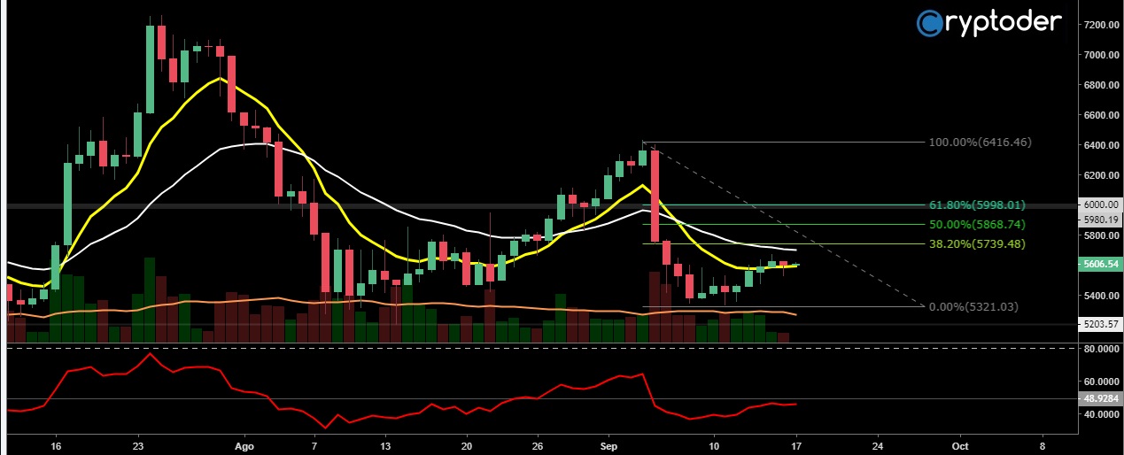 Dibujando un Fibonacci desde el punto más bajo, notamos como el precio aún se mantiene por debajo del 61% de Fibonacci, Bitcoin necesita una recuperación por encima de los €5900 para que podamos considerar una recuperación parcial en el precio.