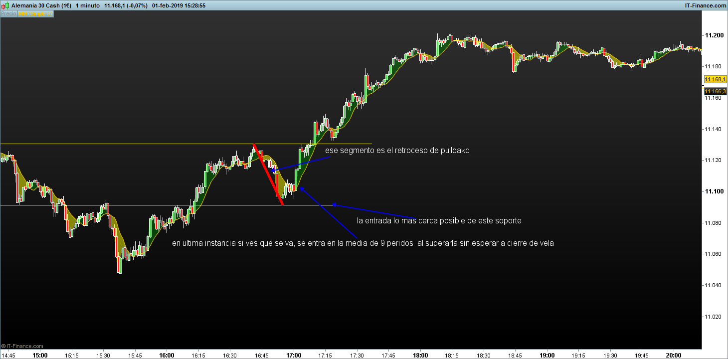 Las entradas deben hacerse en grafica de 1 minuto a la rotura de estructura o al superar la media de 9 periodos en ese timeframe, en ultima instancia se puede entrar al cortar la media de 9 periodos en el timeframe operativo, esta entrada lleva mas riesgo y es mas tardía