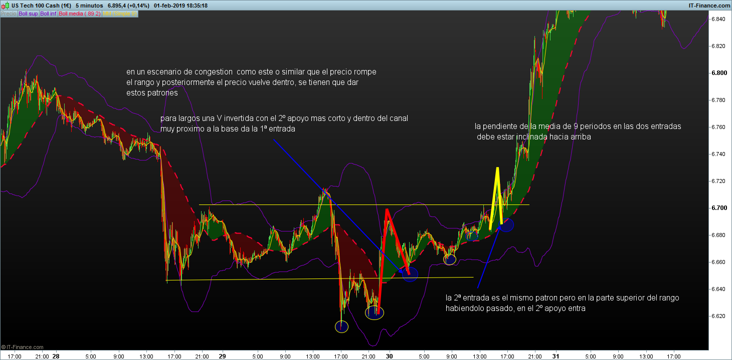 En pautas de congestión entra en el techo y en la base del rango con patrón de V o V invertida con el ultimo segmento mas corto y entra al pullbakc tras la rotura