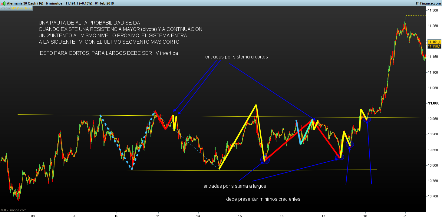 En rango horizontal la operativa trabaja con V o V invertidas, después de marcar una resistencia con dos toques a un mismo nivel o similar, al siguiente intento si forma una V con el ultimo segmento mas corto el sistema da entrada