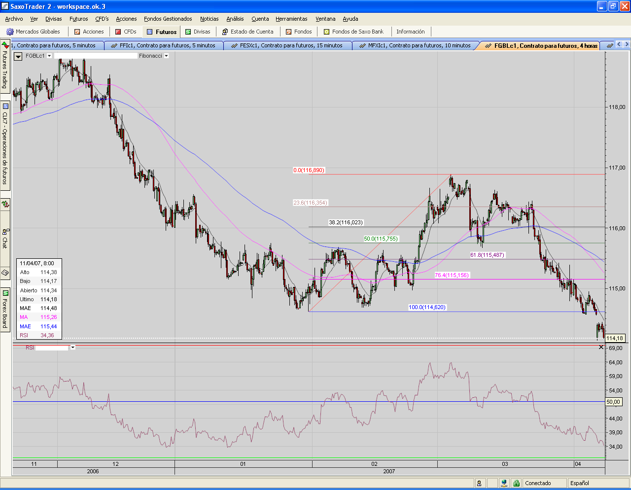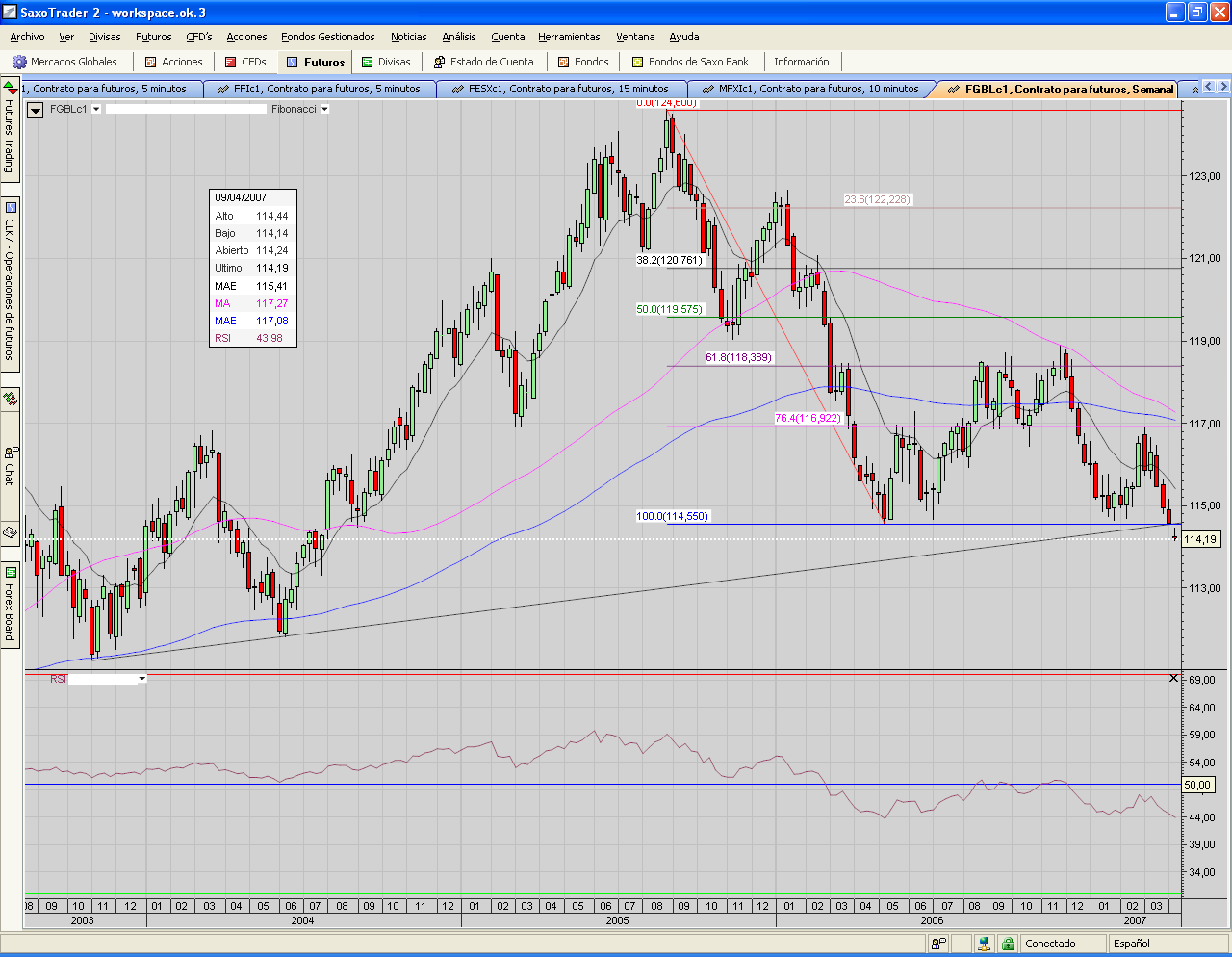 ha roto un soporte importante 114,50-60 de un gapazo, además por ahí pasa una directriz alcista semanal , vamos a ver si Bernanke le da ánimos para cubrir ese gap y recuperarse o de lo contrario su objetivo está en 113,22.