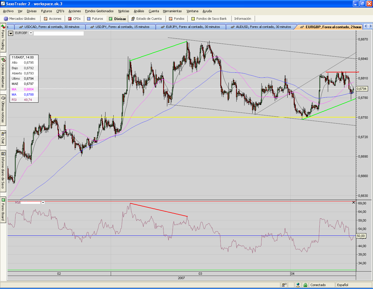Subo un gráfico de EUR/GBP ke está en un momento interesante, después de hacer una oportuna corrección en forma lateral-bajista a toda su subida previa, está en el centro del canal y no da muchas pistas, tenemos ke el BOE dejó los tipos invariables, por lo tanto una subida del BCE podría hacerlo llegar a los 0,6840 y 0,6870, encontraría sus primeras dificultades en 0,6820. Soportes relevantes en la zona 0,6750 y en la banda baja del canal.