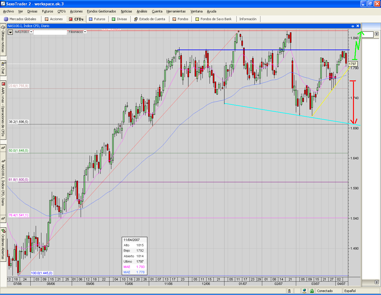 El nasdaq100 index tiene una difícil papeleta en estos momentos, ha cubierto el gap justito justito, pero ahora duda, vamos a seguir esa directriz alcista de corto plazo (linea amarilla) , digamos ke romperla y cruzar a la baja los 1.790 daría posibilidades de iniciar recortes considerables kizá hasta la zona de los 1.695 previo permiso de los 1.775 y 1.750.