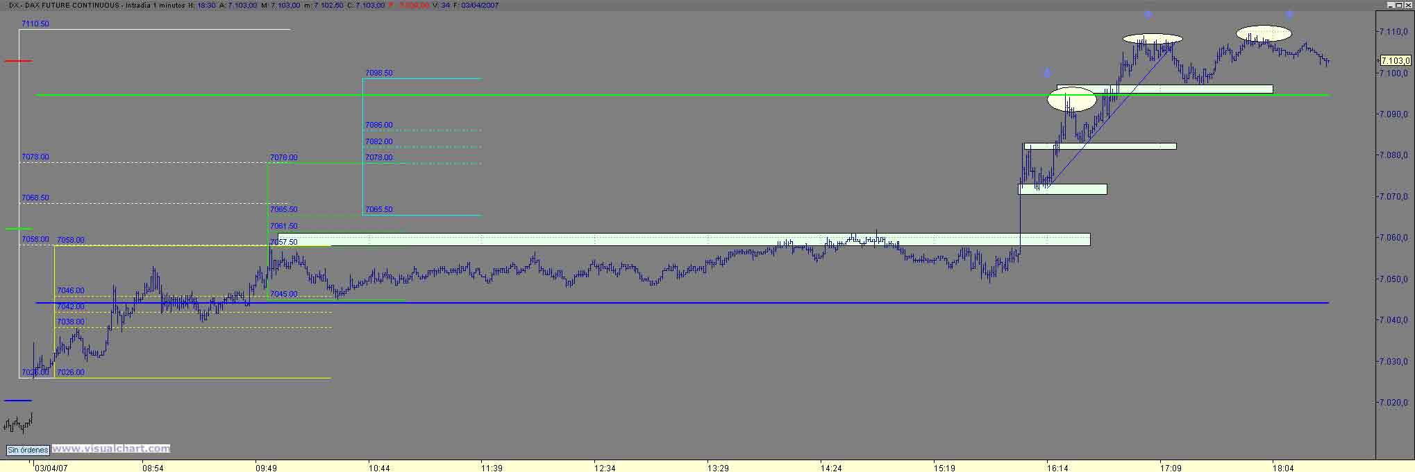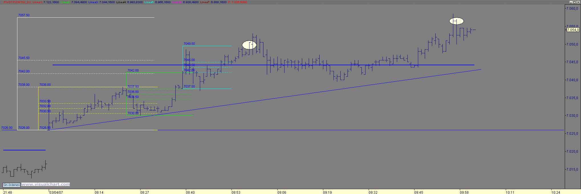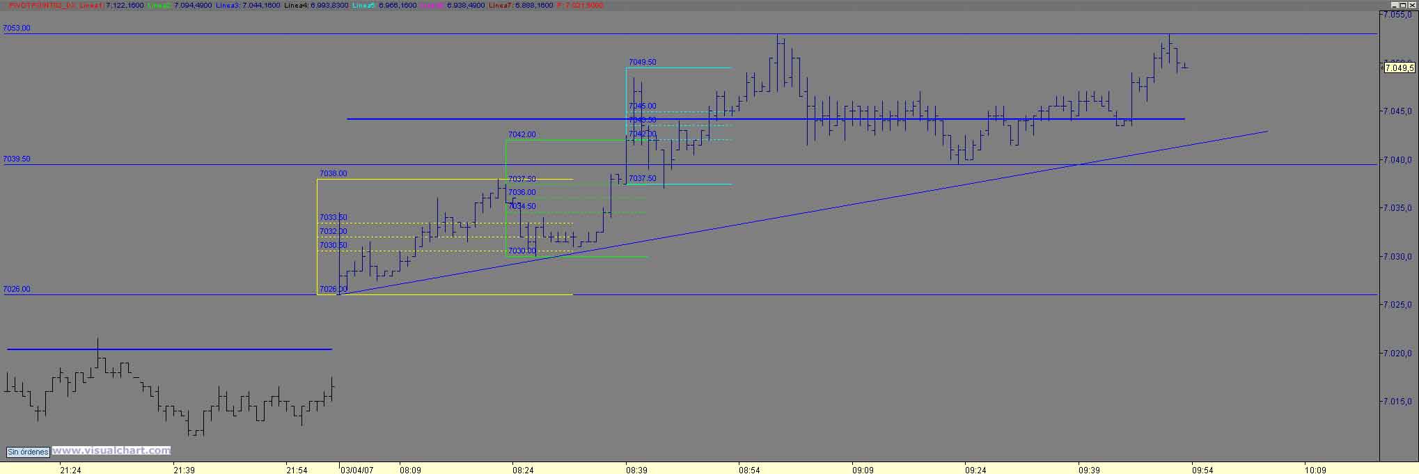 Enhorabuena Tom aunque en el fondo vei dificil mis cortos pero dice el refran que ser pesao es una virtud y lo he vuelto a intentar en el nivel de R2 7095 con un nivel claro de salida el max anterior en 83 y lo he vuelto a intentar en el 7108 7110 donde sale lña proyeccion de ese impulso grande marcado en amarillo y que da como punto final el 7110.50 apoyado en el doble techo al 7109.50 todavia nos da posibilidad oara pegarle otro bocadito, y alguien se preguntara y porque tantoi corto?? cuando solo se ve hacia arriba, pues facil cada maestrillo tiene su librillo y en el mio dice que hay patrones de trabajo que a priori tienen un alto indice de fiabilidad claro pra eso cada vez que se den tienes que poner cebo y hay veces que te quedas con el anzuelo pero bueno siempre te puedes quedar con la agradable conversacion del pescador de al lado y el solecito en el rostro un Saludo