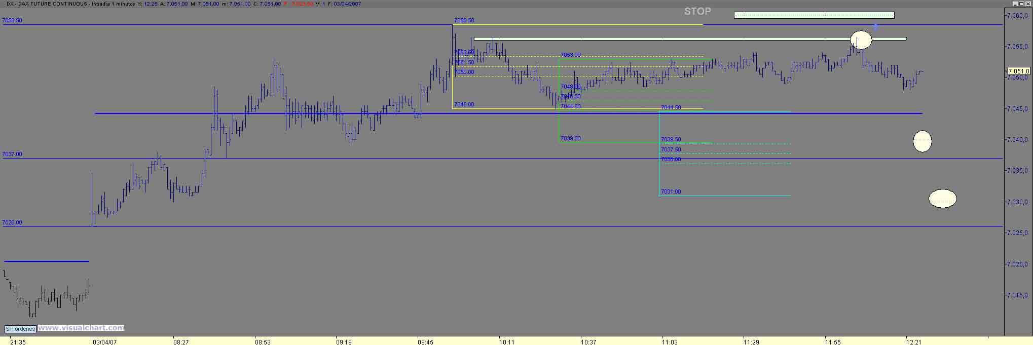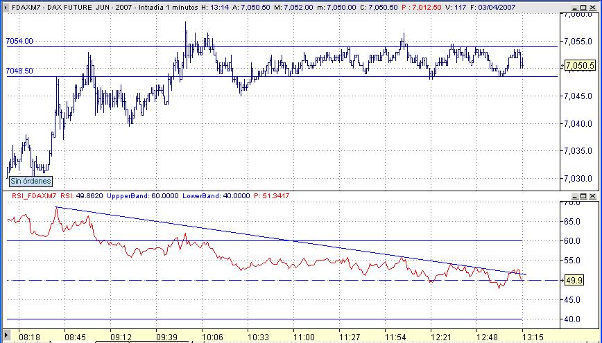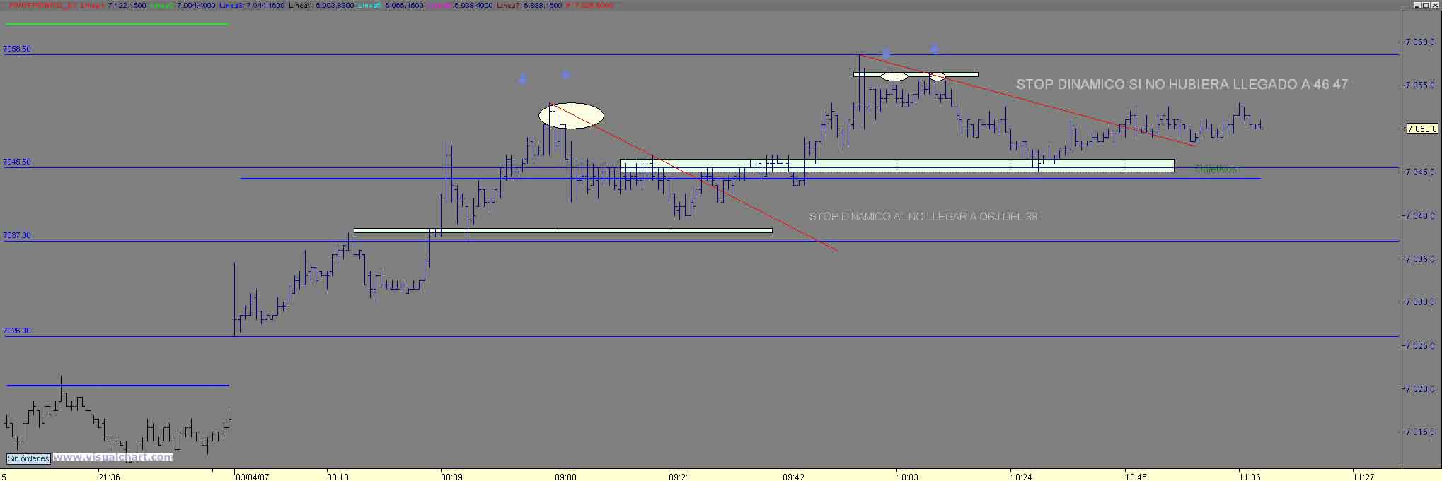 Tom por favor borrar nada al contrario si lo que deseo es que la gente se anime a exponer sus criterios, y te explico la operativa de hoy como comente antes mi punto de ref (aunque la apertura decia que largo) era ese maximo anterior del 52.50 para buscar cortos dandole 2 ptos de stop por encima ya que suele ser que a la primera llegada a punto significativo haga algun retro aprovechable ( para mi aproblechable sabiendo que voy contratendencia son 6 8 10 ptos) y buscandole amen de la divg como bien dices otro apoyo tecnico una vez con el precio a favor si me hace alguna estructura aprovechable con obj superior a algun nivel de control anterior al primer obj marco un stop dinamico de ganacias para que sino llega a obj me saque sin perdidas o con las minimas ganancias posibles (la direztriz roja) y la seg op en los max del 58.50 es clavada a la anterior y si hubiera un tercer maximo en 67 volveria a lo mismo esa es mi op en este tipo de patrones (sobre todo por la mañana por la tarde es otro cantar) confio que os sirva de ref y que en este hilo expongais las vuestras Un saludo