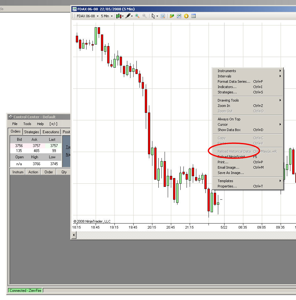 Estas seguro que estas conectado a zenfire? que no te deje elegir "Reload Historical Data" me parece que es porque no estas conectado.