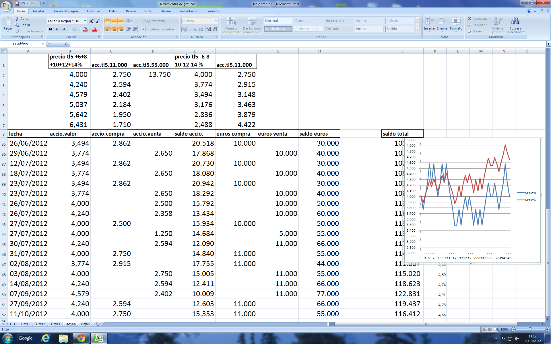 No vale Luis, este hilo no habla de tradear, habla de medio-invertir, habla de medio-conservar, no se, pero esto no es tradear, no vale hacer simulaciones anteriores, para mi esto seria el plan ideal para el que quisiera hacerse un plan de jubilacion a 20 años... 40 operaciones anuales..., sin problemas de pensar... a los tres años... uno piensa en hacer gestion de capital??? puede hacerla tranquilamente... piensa en hacer diversificacion con los beneficios??? puede hacerlo tranquilamente... en 20 añosss ... solo hace falta imaginarse cuanto tendriamos ahora haciendo lo que estoy haciendo con el santander si hubieramos empezado hace 20 años con un capital similar a los 100.000 euros que comence yo...Spirit escribió:Este hilo te lo he respetado al máximo Guevon porque lo has planteado como una prueba-estudio y como tal, lo interesante es ver como evoluciona y a que conclusiones llegas.