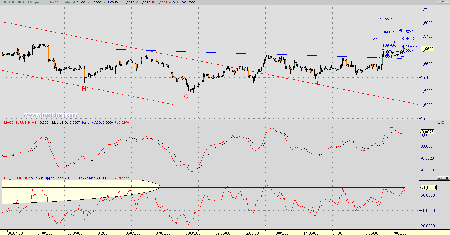 En cuanto al euro bien parece que se pueda ir a los 5830 por un hch invetido roto al alza. Cómo el anterior falló en objvo, pues este no creo que lo haga. Hoy ha roto al alza lo que parece ser una banderita muy mona que nos da un objetivo intermedio en 5740. Por ahora tenemos hch con divergencias bajistas en RSI 1" y está corrigiendo. Sería un buen momento para entrar cdo haya cubierto objvo hch y/o presente divergencias alcistas. Suertes.