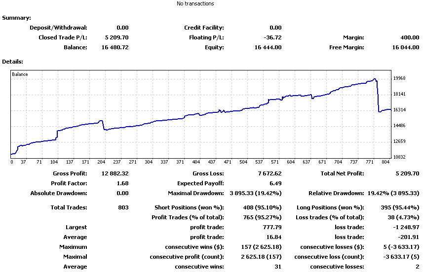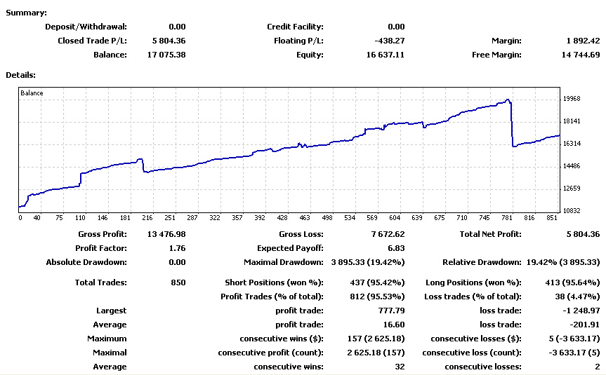 El ratio W/L ya ha bajado al 94,92% que es más lógico que estar por encima del 96%. En este sistema un 1% en el ratio es un mundo para los resultados finales. Lo que viene a indicar es la cantidad de trades que abres y cierras desde que inicias el hedge. Por la filosofía del sistema ya sabemos que el ratio siempre va a ser muy alto, pero debemos olvidarnos de como se maneja este ratio en otros sistemas. Aquí lo que importa es si es del 92%, 93%, 94%, 95%, etc. Hay que encontrar el punto de equilibrio entre esas cifras.