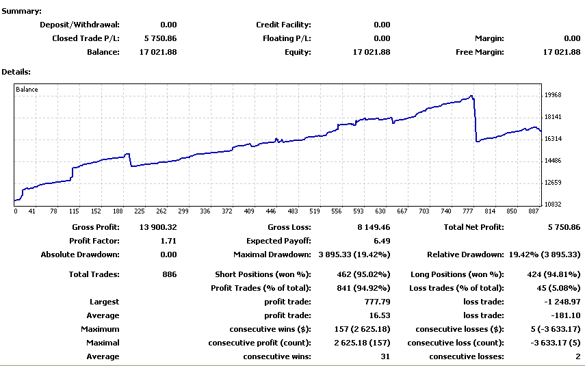El gráfico del balance también es ilustrativo. Fijaros como la pendiente es clavada y ya van 886 trades, para que nadie diga que es casualidad.