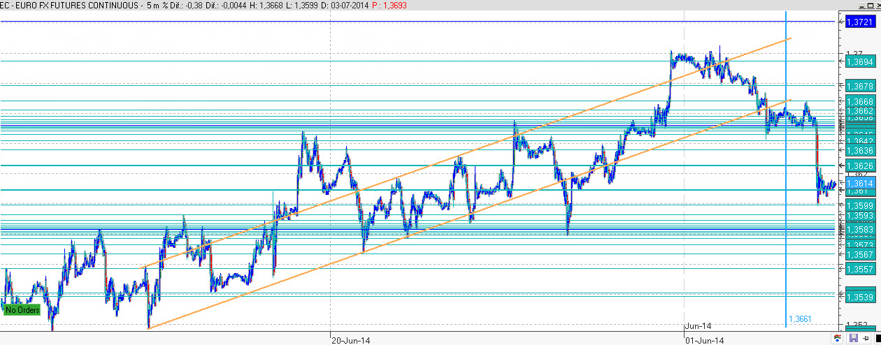 Esta tarde, cuando comentábamos (y desparramábamos), no había oído las declaraciones del sumo sacerdote. Una vez oídas, me han perecido tirando a "light"; nada nuevo, y sin mayores advertencias de matón. Que haya tenido y siga teniendo dadas instrucciones de sacar el bate de vez en cuando, no me extrañaría, pero el bicho (el €/$), me da que con la reacción que se ha aguantado hacia el 1,3610, de momento hace suelo y remontará (salvo bate baseball), no como nueva tendencia, pero me refiero a un movimiento hacia el canal ascendente que venía haciendo.