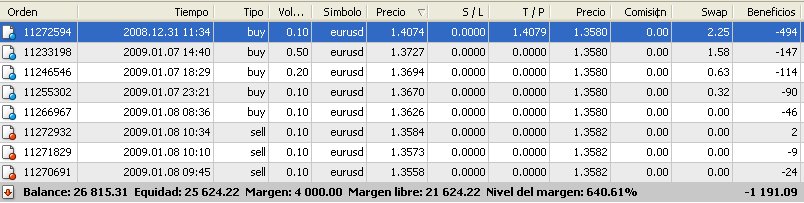 Voy a publicar el estado actual de las posiciones ya que tengo en estos momentos una posición que pierde cerca de 500 pipos, que lleva abierta desde el 31/12/08 y que he ido reduciendo poco a poco hasta quedarme sólo 0,1 lote de la misma. Fijaros en la gráfica como los cierres parciales de esa posición tan perdedora no han modificado sensiblemente la curva. Lo que he ido haciendo ha sido tomar como referencia los 27.000 euros del balance. Cada vez que el balance ha subido por encima he cerrado 0,1 lote y he seguido operando normalmente, así contínuamente hasta llegar a quedarme con 0,1 lote. El último cierre parcial ha supuesto un coste de 364 euros. Ahora lo que intentaré será ir subiendo el balance al menos esos 364 euros y que la equidad se mantenga por encima de 25.500.