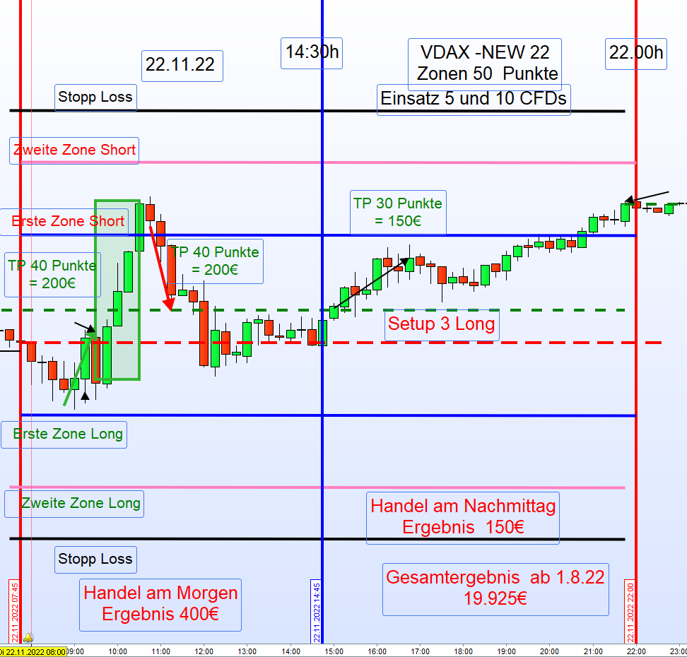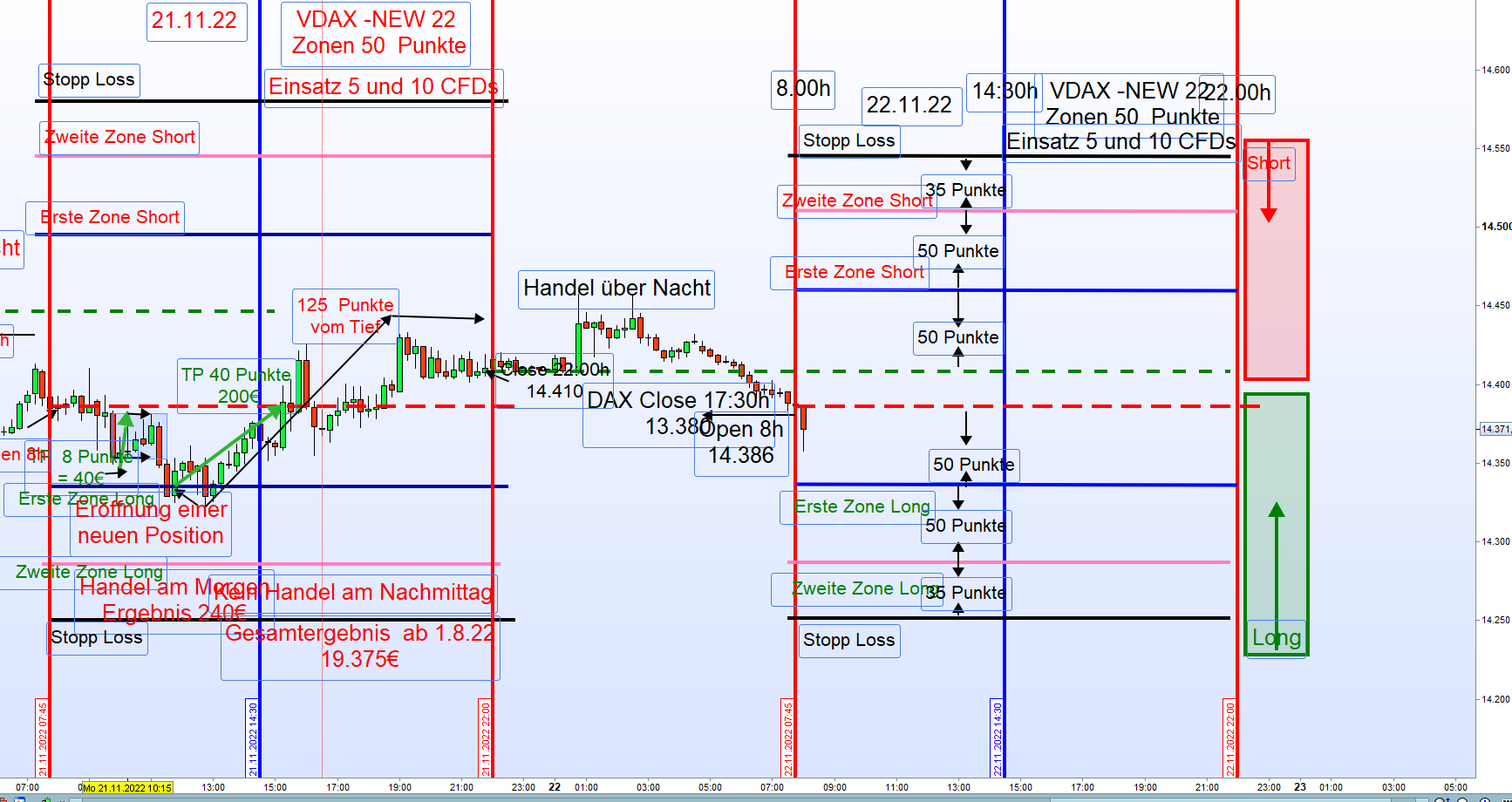 Para una volatilidad 20-25, Georg en su marco operacional fija una distancia de 50 puntos a partir del la apertura o cierre, si tenemos en cuenta las segundas zonas, estaríamos en 100 puntos a cada lado, además habría que sumarle el GAP que se produce entre el cierre del FDAX 22:00 y la apertura del FDAX de día siguiente a las 08:00, por tanto no es tan descabellado pensar en algo parecido a esos 222 puntos para que se produzca una reversión. De todas formas, no hay que centrarse tampoco en los 222 puntos, pues estamos hablando de la media y esto sólo recoge el 50% de los casos. Hay que ser un poco más pretencioso y tomar la media + la desviación típica, es decir 329 puntos de rango total, en este caso seremos más ambiciosos en la selección de trades (menos entradas), pero con mayores posibilidades de éxito al englobar el 70% de los casos.