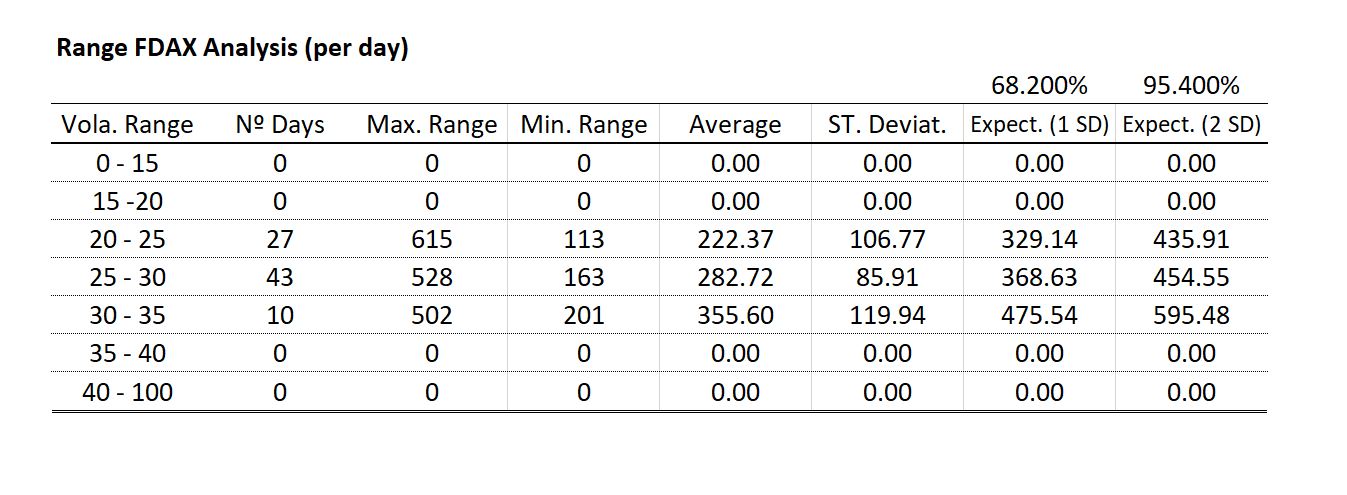 Hasta el momento no hay nada nuevo, pero si profundizamos un poco más en los movimientos de precios del FDAX del rango que genera entre su máximo y mínimo diarios incluido en cada grupo de volatilidad, observamos la siguiente tabla: