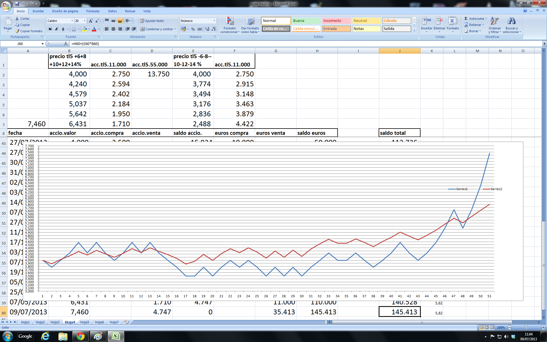 Aqui la ultima hoja con el resultado de tl5... la linea azul es el movimiento del precio la roja el movimiento del saldo de la cuenta convertida a precio... bueno, ya me entendeis...