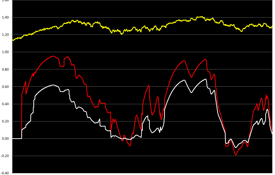 El gráfico explica que mientras el benchmark(amarillo) muestra fortaleza en este caso alcista la curva de correlación entre el capital y el benchmark es positiva, pero cuando el precio del benchmark baja la curva de capital(blanca) se descorrelaciona del benchmark en este caso de la bajada y sigue creciendo o se consolida o baja menos que el benchmark.