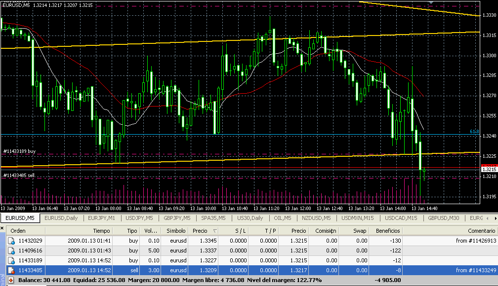 En este caso me encuentro en una situación de apalancamiento exagerado por descuido en la operativa. Anoche intenté abrir una posición buy de 0,5 lotes y como ando haciendo mil cosas a la vez resulta que abrí una de 5 lotes. En el Metatrader me ha ocurrido varias veces lo mismo. Hay que poner todos los sentidos.
