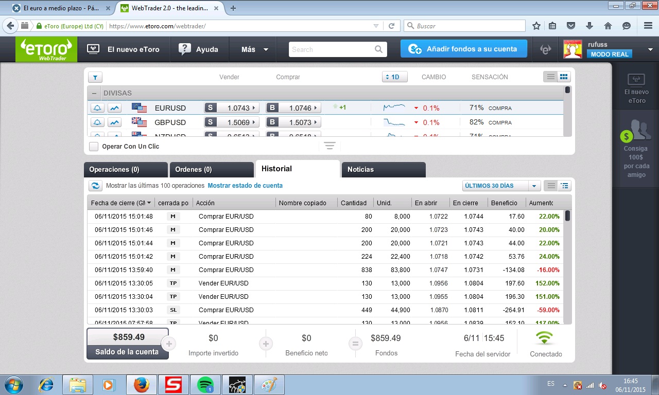 Desde mínimos que tenía la cuenta en 300 $ (llegué a ver un saldo de 240 que no llegó a materializarse) he conseguido triplicar la equity en solo dos semanas. Recuérdese que la debacle fue el 22/10