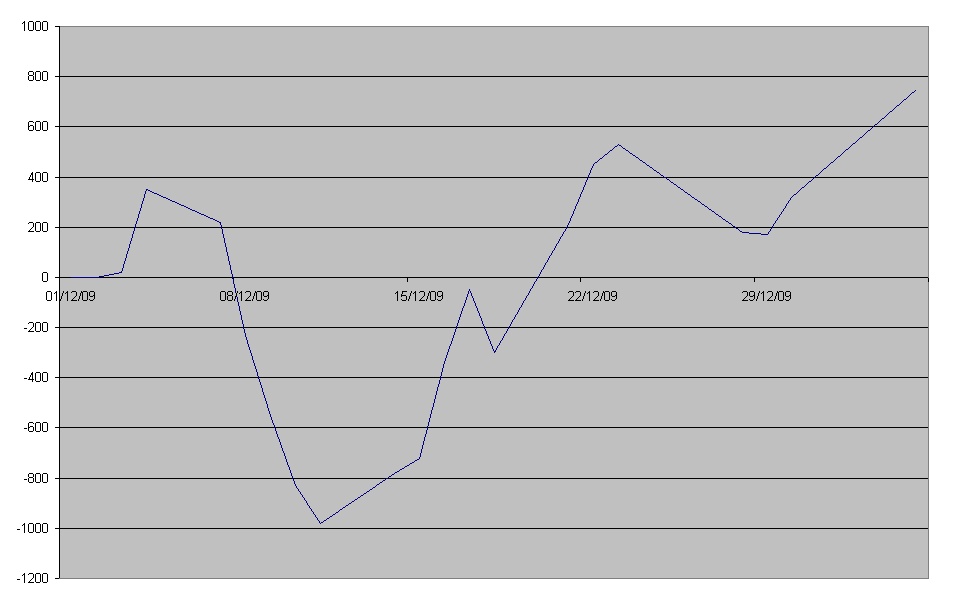 Ya comenté que había mejorado el sistema, pero no publiqué el detalle. Aqui os mando el resultado operando con un contrato. Incluye comisiones, de 2 euros por contrato, que es lo que cobra Interactive Brokers.