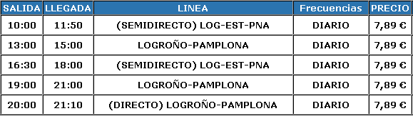Pongo los horarios de Viernes (Pamplona-Logroño) y de Domingo (Logroño-Pamplona). Estos horarios son los de ahora, de aquí a Octubre pueden cambiar, así que recordar revisarlos.